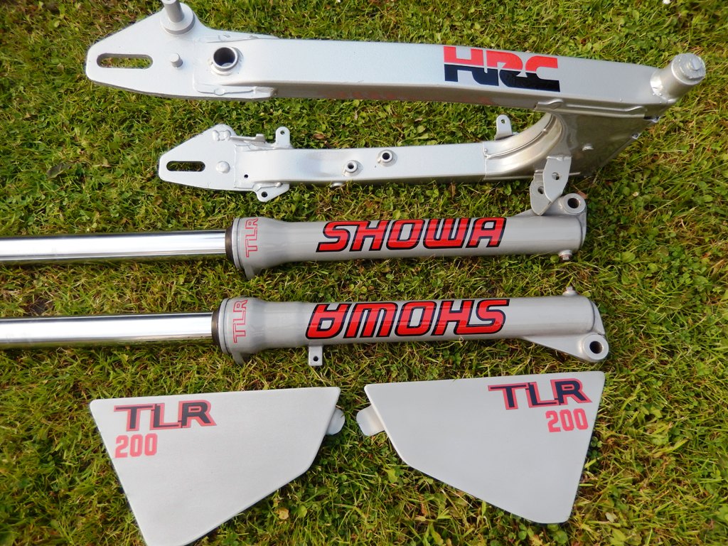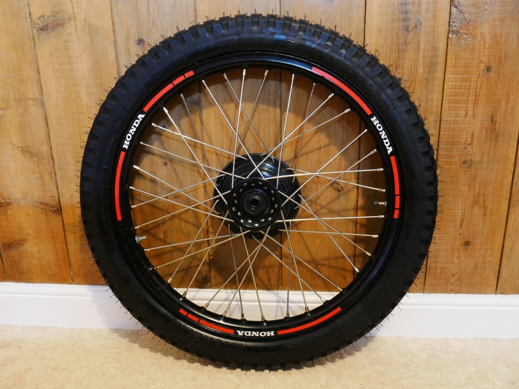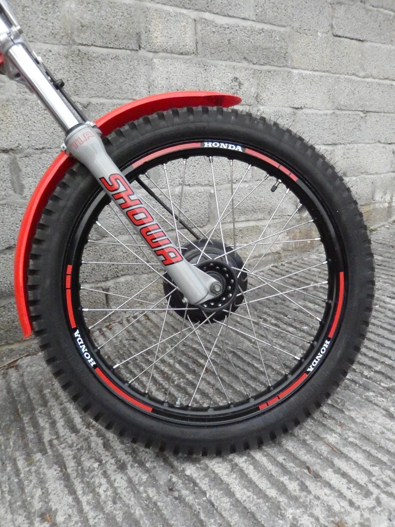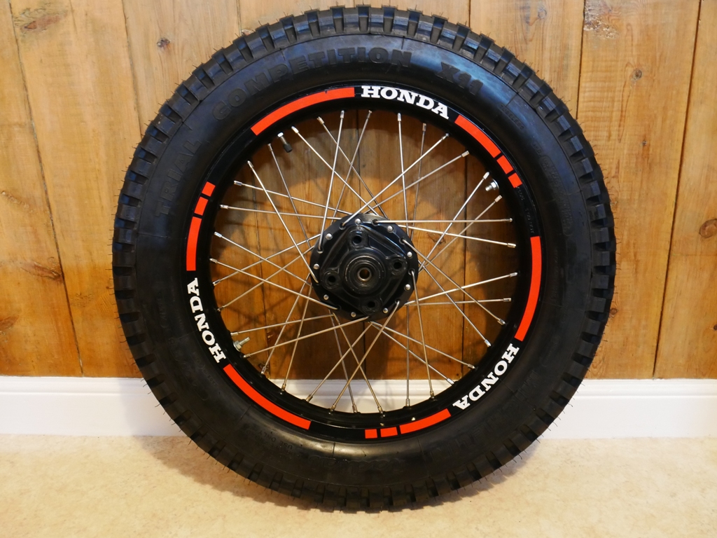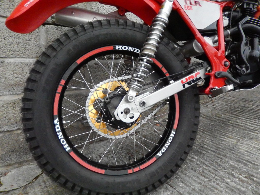 The chrome rims were replaced with alloy rims. They were sandblasted, then sprayed with eggshell black before the decals were applied. The hubs have been machined to reduce weight and laced with stainless steel spokes.